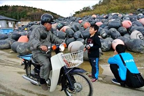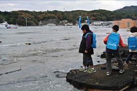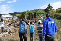 津波で流された瓦礫の処理をするボランティアの人たちを撮影 |