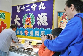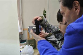 朱里さんのおじいちゃんの魚屋さんを撮影する涼太君 |