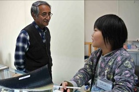 ホタテの貝殻の「パターン」を写す朝陽君 |