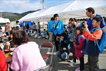 のれん街のすぐ隣にある牡鹿公民館ではこの日、新潟のボランティア団体「越後愛届け隊」によるイベントが開催されていました。食事を提供する人、子どもたちが楽しめるゲームを運営する人、チンドン屋の格好で音楽を奏でる人、楽しむ地元の人びと。お年寄りから子どもたちまで、大勢の人が公民館に集まっています。撮影よりもお菓子や楽しい催しものに夢中になってしまった子どもたち。