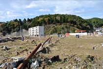 公民館やのれん街のすぐ横に広がる津波の被災地 |