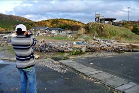 チームAの後に小渕浜を訪れたチームBの海利君。「この場所には大きな滑り台があって、みんなの遊び場だったんです」 |