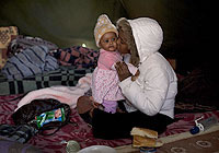 | リビアとの国境地帯、ラスジェディールにある避難キャンプのテントに座るソマリアからの移民の親子。 |