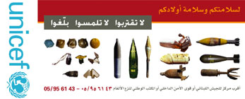 ユニセフは、停戦発効前から、チラシやテレビ・ラジオの公共CMを通じ、特に子どもたちに不発弾の危険性を伝え、「不発弾に近寄らないで!触らないで!」というメッセージを伝える努力を続けています。しかしながら、不発弾による被害は後を絶ちません。国連のまとめでは、停戦発効以来、クラスター爆弾をはじめとする不発弾によって1日平均1人の命が奪われ、3人が重軽傷を負っています。