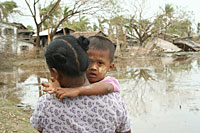 | サイクロンに襲われ瓦礫の山となった村の中を、(瓦礫で歩けない)子どもを抱えている母親。 |