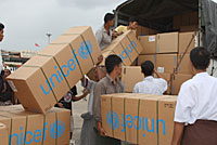 | ヤンゴンの空港に到着したユニセフからの支援物資 |