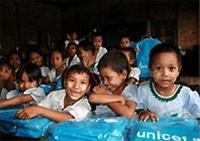 | ボガレイの町にあるネット・チャン小学校。ユニセフ支援の新しい通学かばんを受け取って嬉しそうな子どもたち。ユニセフは、サイクロン被災地の学校に、17万5,000個の通学用かばんと文具のセットを支援しました。 |