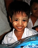5月に大型サイクロン「ナルギス」に襲われ、深刻な被害を受けた地域にあるボガレイの町。この町のアウク・パイン小学校では、特別な日を迎えていました。学校の児童619人全員に、ユニセフ支援によって新しい通学用かばんが配られることになったのです——かばんの中には教科書、ノート、ペン、鉛筆、定規、鉛筆削り、消しゴムなども入っています。