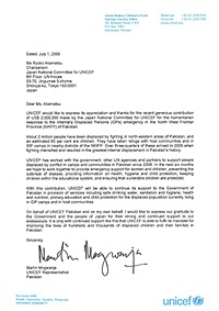 この度、パキスタン北西辺境州の国内避難民のための人道支援活動資金として、200万米ドルの資金をご提供いただいたことに対し、ユニセフを代表して、心から感謝の意を表します。