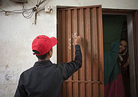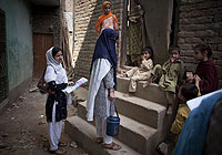 | 全国一斉予防接種デーのこの日、パキスタンのラワルピンディーで5歳未満の全ての子どもたちにポリオ予防接種を行うため、各家を訪れる女性の予防接種スタッフたち。 |