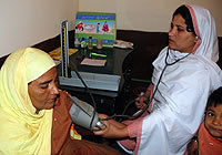 | ユニセフの支援で訓練を受けた地域の助産師に、妊婦検診を受けるムラサット・ペルベイズさん |