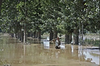 | カイバル・パクトゥンクワ州で、洪水の水の中を歩いて、崩壊した自宅から持ってきた木材を運ぶ男の子。 |