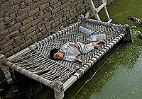| パキスタン北西部の洪水被災地。床上まで水が上がってしまった家の一角にあるベッドで寝ている子ども。この地域の住民350万人中、250万人が、洪水の被害を受けたものと見込まれています。 |