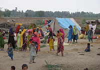 | 支援物資の到着を待つ、南部のシンド州に逃れた被災者たち。その多くは、洪水で全ての所持品を失った。 |