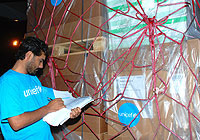 | コペンハーゲンにあるユニセフの物資供給センターから、南部の港町カラチに届けられた緊急支援物資100トンを確認するユニセフのスタッフ。 |
