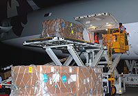 | 貨物機から降ろされるカラチに届けられた支援物資。 |