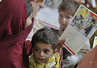 | パキスタン北西部にある学校で行われた、保健と衛生に関する指導を行う集まりの中で、配られた冊子を読む女性。 |