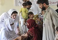 | チャルサッダの避難民キャンプの中に、ユニセフの支援で設置された仮設の保健センターで行われている予防接種活動。 |