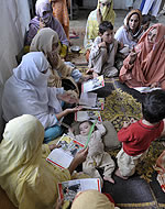 | チャルサッダの避難民キャンプで、保健と衛生の知識の普及をはかる保健員。 |