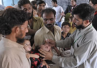 | チャルサッダにユニセフが設置した仮設の保健センターで行われている予防接種活動。 |