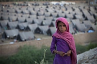| シンド州スックルにある避難キャンプの前に立つ女の子。 |