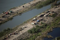 | 周囲が冠水した狭い場所で、避難を余儀なくされている人々(シンド州)。 |