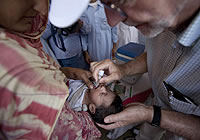 | カイバル・パクトゥンクワ州チャルサッダにある避難所となっている小学校で、ポリオのワクチンを投与するユニセフのアンソニー・レーク事務局長。 |