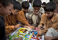 | カイバル・パクトゥンクワ州チャルサッダにある避難所となっている小学校で、ユニセフの支援で設置された「子どもに優しい空間」で、ボードゲームに興じる子どもたち。 |