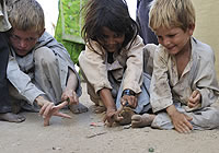 | 午後、テントとテントの間に出来た日陰で、おはじきで遊ぶ子どもたち。 |