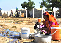 | シンド州タッタの避難キャンプで、強い日差しが照りつける中、衣類を洗う女性。 |