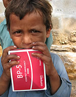 | パキスタン・シンド州のタッタ地区で、ユニセフが提供している治療用の食事、高カロリービスケットを持つ子ども。 |