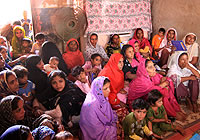 | パキスタンで発生した洪水の影響を受けたシンド州タッタ地区で、「女性保健員」が行う保健教育の授業に参加する女性と子どもたち。 |