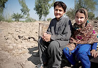 | サルマちゃん(右)とミスバー・ウッディンちゃん。カイバル・パクトゥンクワ州北西部のバンド・コライ村にあった、洪水で破壊された家族と一緒に暮らしていた土壁の家があった場所で。 |