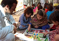 | カイバル・パクトゥンクワ州のバンド・コライ村にあるユニセフが支援している「子どもに優しいセンター」で遊ぶサルマちゃんと子どもたちと、心理カウンセラーのサッジド・グルさん。 |