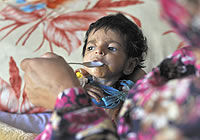 | ユニセフの支援で運営されるスワート州の病院に設置された栄養不良治療センターで治療を受ける、ルクサール・サイド・アリ・カーンちゃん(7ヶ月)。 |