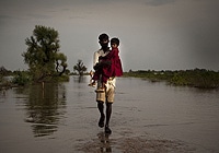 | 洪水で水が溢れた道を子どもを抱えてわたる男性(2011年9月11日、パキスタン・ディグリ)。 |
