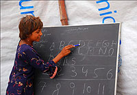 | ユニセフの支援で、洪水の被害を受けたブハラ避難キャンプに設置された臨時学習センターで、黒板に書かれた文字を読むノオル・ジェハンちゃん。 |