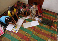 ユニセフは「安全に遊べる場所」を23ヶ所設置し、約6,200人の若者が各種活動に参加しています。また、画材、文房具、スポーツ用品などの室内用レクリエーションキット約500組が武力衝突の続く地域に住む家族に配給され、計2,000人の若者や子ども達が自宅で安全に遊べるようになりました。ユニセフはガザ地区の大学生24人へのカウンセリング技能研修を支援しました。加えて、中退率の高い地域にある4つのユース・クラブが「若者にやさしい学習空間」を設置し、非公式教育や課外活動の拠点になっています。現在、「安全に遊べる場所」やユース・クラブの運営に関係する地域の人々や若者が、子どもの権利や子どもへの接し方についての研修を受けています。 子どもの保護 戦闘の続くガザ地区では、個別カウンセリングを提供するセンターが20ヶ所あります。通話料無料の相談ダイヤルによって、ソーシャルワーカー、弁護士、心理的ケアの専門家からのサポートをうけることができます。夏の間は、約50ものイベントが企画され、約1万3,000人の子ども達を楽しませました。暴力により心に傷を負った子ども達への心理的、社会的、法的支援も始まりました。また、ガザ北部などの地雷の被害にあう危険が高い地域に住む子ども達2,000人以上に地雷事故を予防するための教育を実施しました。また、ユニセフとパレスチナ赤新月社が地雷への注意を促すために製作した歌が地元の若者ラジオ番組で流されました。 |