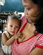 | 生後11ヶ月のブンソちゃんに母乳をあげる、5人の子どもの母親のリア・マニラノさん。洪水の水位が上がって来た時には、ブンソちゃんを手放さないように懸命だったと言います。 |