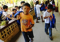 ノート、ペン、クレヨン、のり、スリッパ、水筒、はさみ等が入った、ユニセフ支援による学校かばんを受け取るために、子どもたちは中庭に並び、ユニセフは、1,145人全員にこのかばんを配布しました。