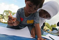 | 2004年12月、スマトラ沖で発生した地震による影響を受け子どもたちへの心理社会的な支援として、ユニセフが支援した資材を使って遊ぶ2歳の女の子と教師。 |