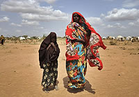 | 女の子を連れて、息子のイブラヒムちゃんを腕に抱えるハワ・イッサクさん(21歳)。イッサクさんは、ケニアとソマリアの国境付近にあるダダーブのイフォ避難キャンプで出産した。 |
