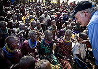 | ケニアのリフトバレー州トゥルカナ地域、カプア村の子どもたちと話すユニセフのアンソニー・レーク事務局長。 |