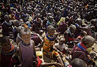| ケニアのリフトバレー州トゥルカナ地域で、ユニセフのアンソニーレーク事務局長に会うために集まった子どもと女性達の間で立つ子ども。 |