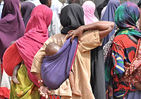 | ケニア・ダダーブにあるハガデラ避難民キャンプにある病院で、子どもを背中に抱えながら順番を待つ母親たち。 |