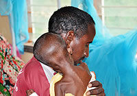 | ケニアのダダーブにあるハガデラ病院で、栄養不良のアデンちゃんを抱きしめるアブディレさん。 |