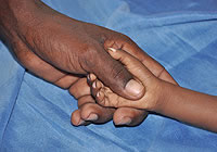| ケニアのダダーブにあるハガデラ病院で、深刻な栄養不良から回復しつつあり、眠っているアデンチャンの手を握るアブディレさん |