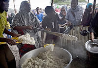 | ソマリアのモガディシュにある避難民キャンプにある食事センターで、避難民のために食事を提供する保健員。 |