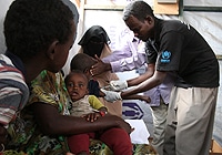 | ケニア北東部のダダーブにあるハガデラ避難キャンプで、肺炎球菌の予防接種を受けるために母親の膝の上で順番を待つ生後9ヵ月のモハメッドくん。 |