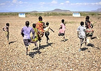 | 放課後、校庭で遊ぶトゥルカナ地域の子どもたち。奥に見えるのは、ユニセフが設置したトイレ。現在、近くの深井戸から水道を引く作業が進められている。 |